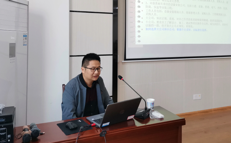 梁磊结合自身多年的工作经验,首先向与会的老师和同学详细地介绍了环境工程专业的就业前景、就业方向、就业类别以及每个类别的主要对口单位及相应的职位要求。他认为,环境工程是一个典型的“越老越吃香”的专业,我们国家环保事业尚处于初步发展阶段,环境工程未来的就业前景光明。随后,梁磊总工还向在场的老师和同学们介绍了自身所从事的工作领域——烟气脱硫脱硝工艺设计。他主要介绍了脱硫脱硝技术的发展历程,包括烟气排放标准、烟气脱硫技术概况、烟气脱硝技术概况等相关内容。