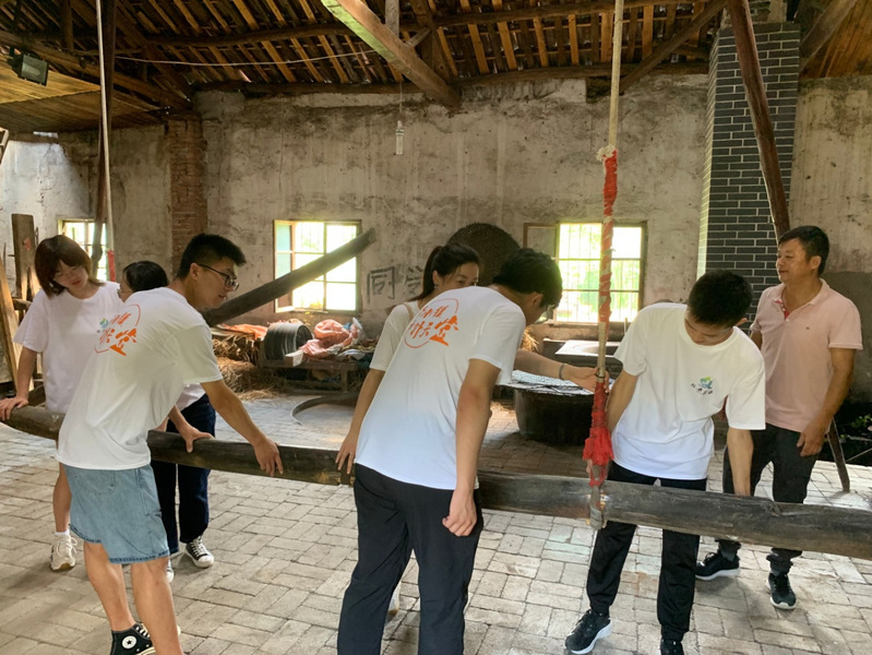 在漫长的历史沉淀中,手工压榨茶籽油的技艺世代相传,从采果到出油过滤需要十多道工序,才使得古法榨油这一工艺香醇久远,虽然现代机械榨油技术得到了普及提高了茶籽油产量,但古法榨油却是传统手工制作中一道不可忘却的风景。很难想象一粒粒小小的菜籽竟在一个160斤的大木棒的帮助下酿成了一桶桶香气喷喷的油。非物质文化遗产传承人陈师傅向同学详细介绍了榨油的工艺和程序,还让同学们亲身体验一下榨油的过程,同学们无不被这种传统的榨油工艺所折服。