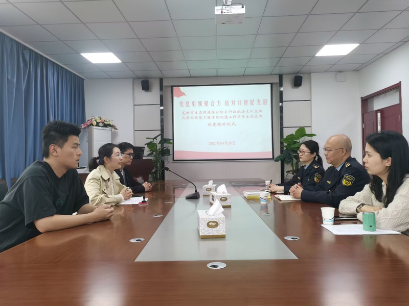 发挥党建引领作用,为支部建设增添新动力,4月28日上午,在化环公司会议室举行环境工程系员工党支部与芜湖市生态环境保护综合行政执法支队共建结对仪式,仪式由环工系员工支部支部书记王冰冰主持,芜湖市生态环境保护综合行政执法支队支部副书记任传军、人教科科长吕璐等人参加。