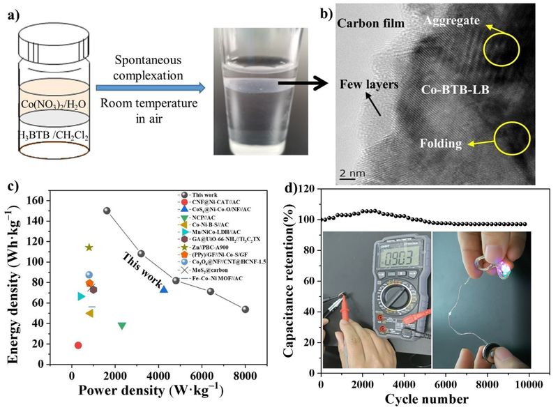 图2 (a) 二维MOF纳米片Co-BTB-LB的合成方法示意图;(b) 二维MOF纳米片Co-BTB-LB的HRTEM图;(c) 本工作与其他有报道的非对称超级电容器材料的能量密度和功率密度比较图;(d) 非对称超级电容器在电流密度为10 A·g−1时的循环稳定性测试。插图:非对称超级电容器设备点亮发光二极管的示意图。