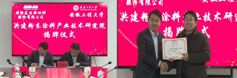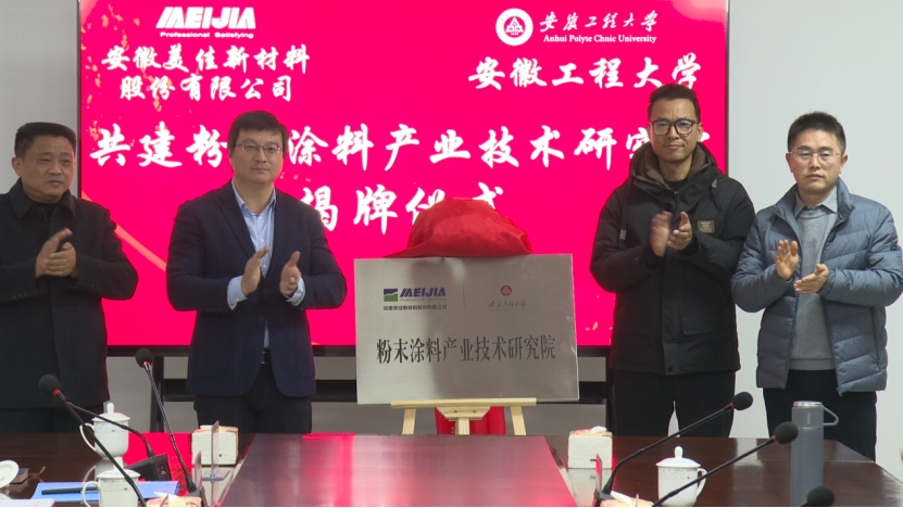 1月5日,公司与安徽美佳新材料股份有限公司共建的“粉末涂料产业技术研究院”揭牌仪式在安徽美佳新材料股份有限公司举行。副董事长高彦峰、繁昌区委书记瞿辉、芜湖市科技局副局长安康、繁昌区管委会主任高翔、繁昌区副区长华光、繁昌区经信局局长赵福、繁昌区科技局局长陈守峰、美佳新材料董事长王方银、总经理王鹏出席本次活动。校社会合作处、科技处、bevitor伟德国际1946相关负责人,美佳新材料主要部门负责人等共同参加了活动。