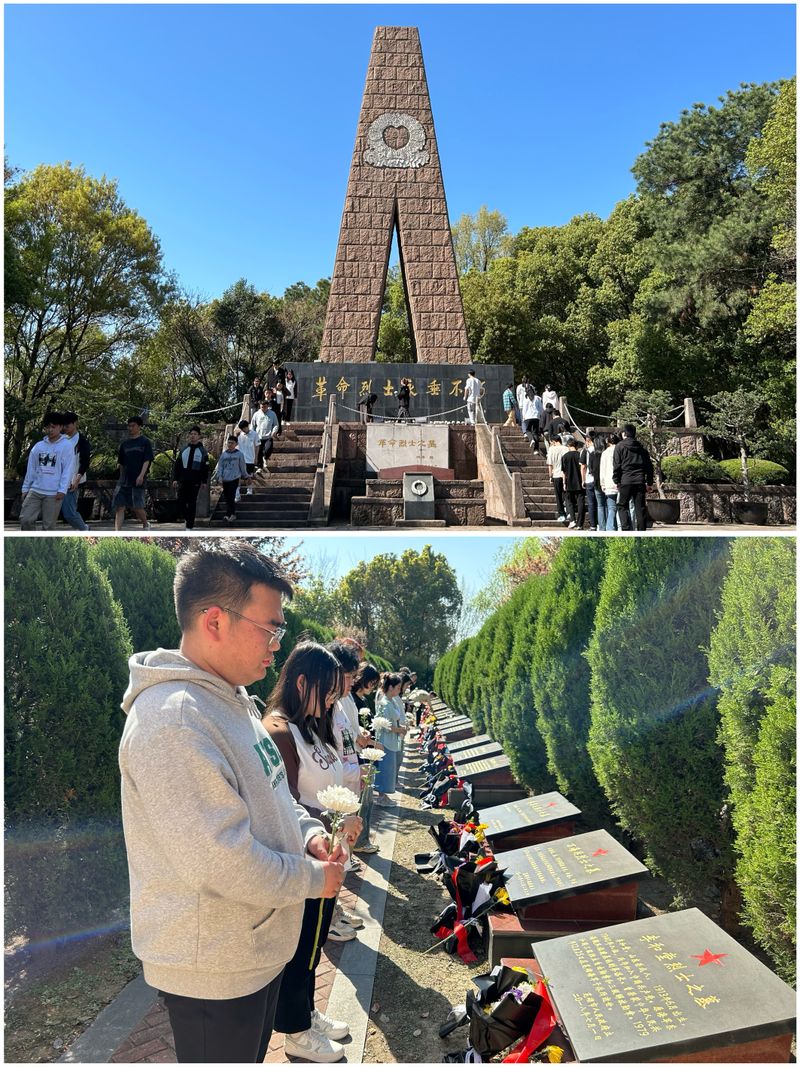 在革命烈士纪念碑前,全体人员昂首肃立,集体默哀,缅怀先烈,寄托哀思。师生们在纪念碑前一同献上一捧新菊,用献花、默哀的方式向革命先烈们表达缅怀和哀思。