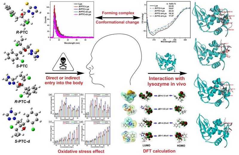此外,为进一步研究手性污染物对生物诱导的氧化应激效应和分子毒理学机制,通过选择HepG2细胞以及模式蛋白(血清白蛋白以及溶菌酶)来模拟手性污染物在生物体内的迁移转化机制以及对机体产生的氧化应激对映体选择性机制,建立了预测手性污染物环境行为和评价手性污染物对映体选择性微观毒性的新方法,明确了手性污染物微观毒性及在靶标环境中的累积效应。上述研究为预测手性污染物对映体在环境中的行为和归趋提供技术支撑,为其在生物体中的转化提供了理论依据,相关研究结果发表在Int. J. Biol. Macromol.2024, 266, 131246(中科院一区),Pestic. Biochem. Phys. 2023, 197:105696(中科院一区)和Int. J. Biol. Macromol. 2023, 240, 124541(中科院一区,ESI高被引)。