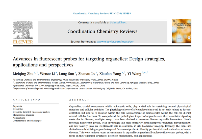 为了从细胞器层面推动荧光探针技术在环境监测与毒理学领域的应用,该团队系统综述了细胞器靶向荧光探针的合理设计、传感性能优化及其在成像领域中的应用,提出了该领域现存的挑战和未来可期的发展方向。细胞器靶向荧光探针为研究人员提供了观察细胞器内部微观环境的新视角,有助于深入理解细胞内生理和环境毒理学过程。这些探针的发展和应用将推动细胞生物学和环境毒理学领域的进步,为未来细胞器层面的生理生态过程和环境毒理机制的研究提供了重要思路。相关成果以“Advances in fluorescent probes for targeting organelles: Design strategies, applications and perspectives”为题在《Coordin. Chem. Rev.》上在线发表,文章DOI号为https://doi.org/10.1016/j.ccr.2024.215893。