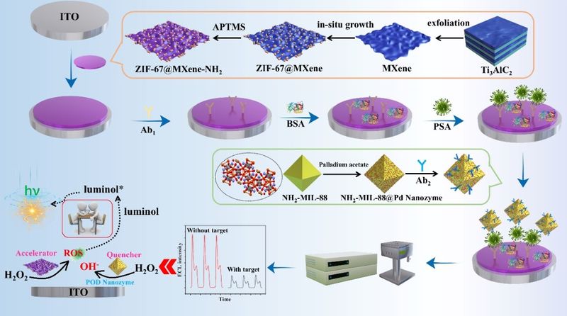 探索新型电化学发光(ECL)共反应加速剂,构建超灵敏传感检测体系是开发先进ECL传感器的重点研究内容。然而,高效共反应加速剂的设计及增强机制方面的研究仍面临巨大挑战。本文设计开发了一种ZIF-67@MXene纳米片复合材料,其良好的平面导电性和限域微孔道结构使其在鲁米诺-H2O2ECL体系中实现了显著的电化学发光增强。机理研究表明,由于羟基自由基(·OH)和单重态氧(1O2)在ZIF-67@MXene纳米片上的吸附能较低,在ZIF-67@MXene上可选择性优先生成·OH1O2,从而使鲁米诺的ECL效率提高830%。通过设计一种新型NH2-MIL-88@Pd纳米酶,该团队构建了一种“on-off”免疫生物传感器,实现了对前列腺特异性抗原的超灵敏检测,其线性检测范围扩大了3个数量级。检出限由1.44 × 1011提高到9.1 × 1013 g·mL1。本研究为肿瘤标志物的超灵敏检测提供了一种新的策略。