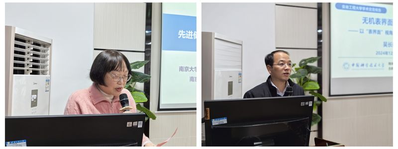 报告会上,吴长征教授做了题为“无机表界面合成化学”的学术报告。吴长征教授就表界面化学合成方法学做了较全面的介绍,包括表面阴离子修饰调节能带结构、晶体外延生长调节表面应力以及利用全单晶剥离法制备大尺寸二维新材料等方面。随后,以零维颗粒表界面疏水改性解决环保型气凝胶绿色生产为例系统介绍了表界面合成的功能应用。期间,吴长征教授就师生提出的学术问题进行了详细耐心的解答,现场师生深受启发。