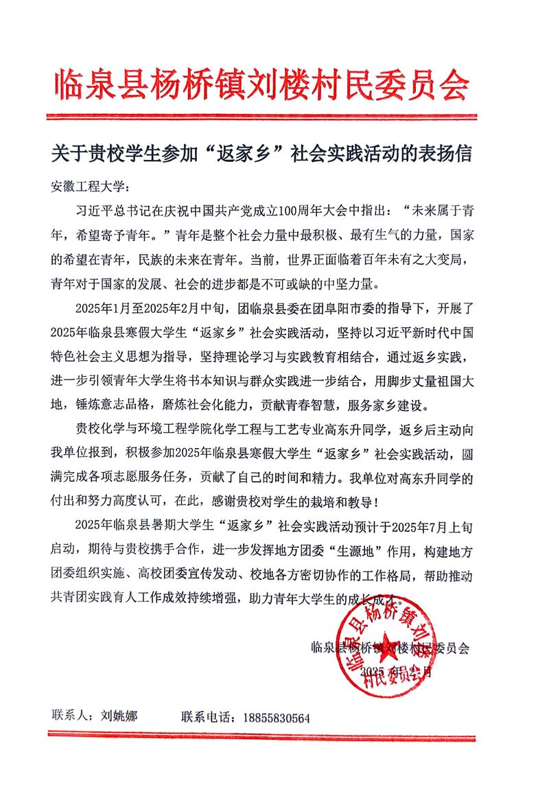 2月17日,公司bevitor伟德国际1946化工242班学子高东升在寒假期间积极参与“返家乡”社会实践活动,凭借出色的表现和无私奉献的精神,获得了当地相关单位的高度认可,并收到了表扬信。