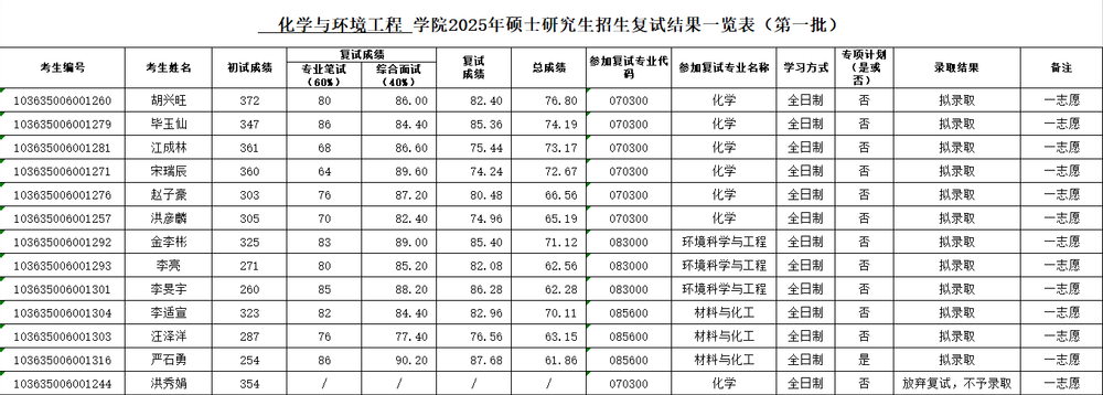 2025年硕士研究生招生复试结果一览表(一志愿)