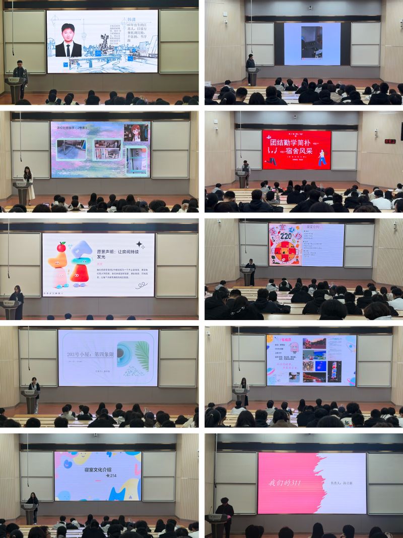 本次比赛历时近一个月,吸引2025级全体宿舍踊跃参与,最终10个宿舍入围决赛。决赛现场,各参赛寝室通过PPT汇报和视频展示等形式展现寝室的独特文化魅力:有的以“书香为伴”为主题,分享寝室学习互助的日常,彰显勤学笃行的氛围;有的聚焦“和睦共处”,用趣味故事串联起室友间的暖心瞬间,传递团结友爱的力量。每一间寝室都窗明几净、整洁有序,从学习上的互帮互助到生活中的彼此包容,用真实的场景和真挚的情感,诠释了“寝室是家,凝聚是光”的深刻内涵。