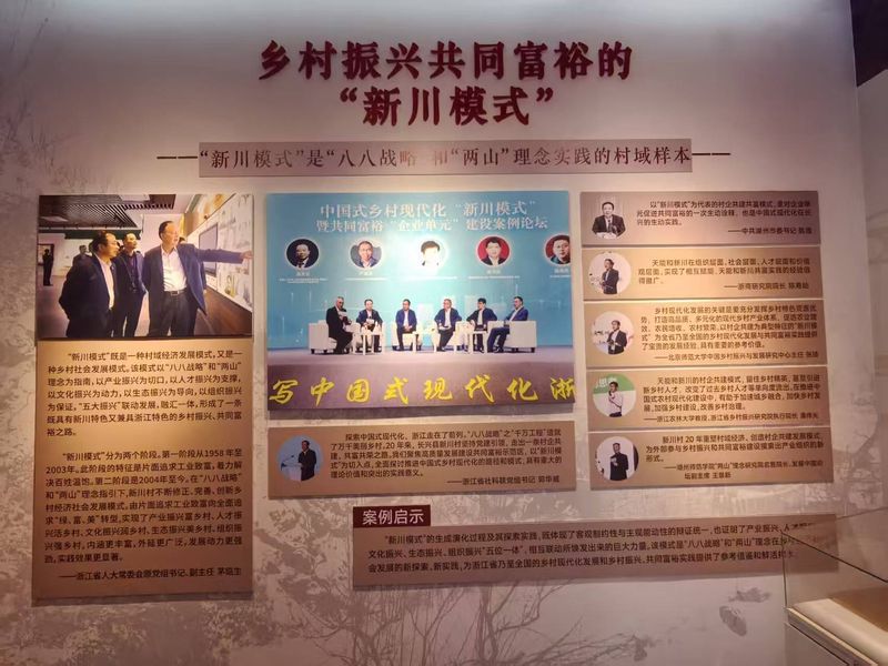 随后,来到新川村乡村博物馆。从泛黄的老照片到充满烟火气的旧农具,从记录村落变迁的文献到展示乡村振兴成果的展板,成员循着展陈脉络,清晰看到了新川村从传统农耕到产业兴旺的发展轨迹。馆内陈列的乡村文化展品与新时代建设成就,可以直观感受到家乡在时代浪潮中的蝶变,也深刻理解了中国特色社会主义给乡村带来的蓬勃生机。