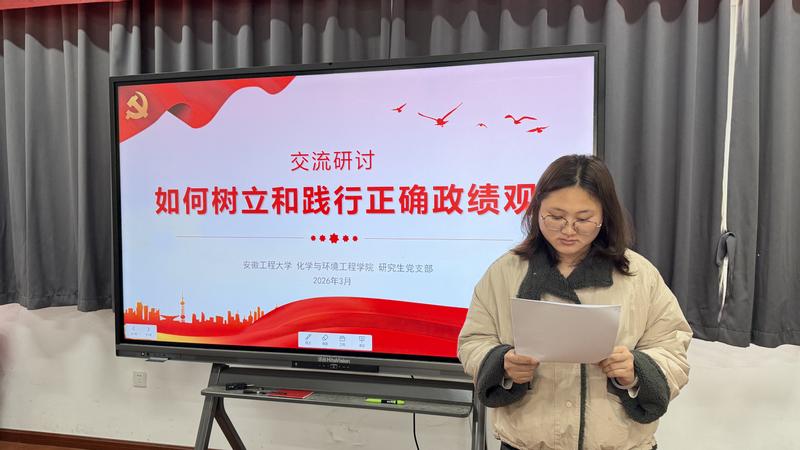 集中学习后,与会党员结合自身科研学习、支部工作、社会实践经历,分享学习心得、交流感悟体会,现场氛围热烈浓厚。参与工业废水深度处理的党员汤馨宇谈到,树立和践行正确政绩观,要摒弃重论文、轻实效的浮躁心态,扎根实验室反复调试工艺参数、实地取样监测污染数据,紧盯生态环境治理痛点难题,把科研成果落到解决实际环境问题上;研究绿色催化合成的党员陈丽敏表示,青年科研党员的政绩,不在于短期出成果、发文章,而在于坚守科研诚信,深耕低碳环保领域,研发绿色高效、环境友好型化工技术,助力行业绿色低碳转型,用实打实的科研实绩践行初心。大家一致认为,树立和践行正确政绩观不是空洞的口号,而是体现在每一次实验操作、每一组数据采集、每一项课题攻坚的日常点滴中,要立足专业特色深耕科研主业,不搞“表面功夫”、不做“虚功”,以严谨务实的治学态度树立和践行正确政绩观。