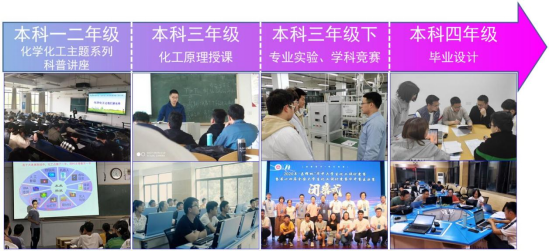 《化工原理Ⅰ》是化学、化工及相近专业的核心专业基础课,对培养员工的基础化学工程思维和能力非常重要。公司在该课程的课程思政建设过程中,一方面通过积极支持教师参加各类教研会议、积极组织校内教研活动等多种途径提升教学团队课程思政教学能力。另一方面,围绕课程思政目标,在课程内容中挖掘出了36个课程思政元素,建立了课程思政案例库,并创新了4种课程思政教学方法,解决了理工科专业课程思政易出现“两张皮”现象的难题。更重要的是,课程团队还将课程思政做了前后延伸,建立了覆盖整个本科阶段的全过程育人模式(图1)。